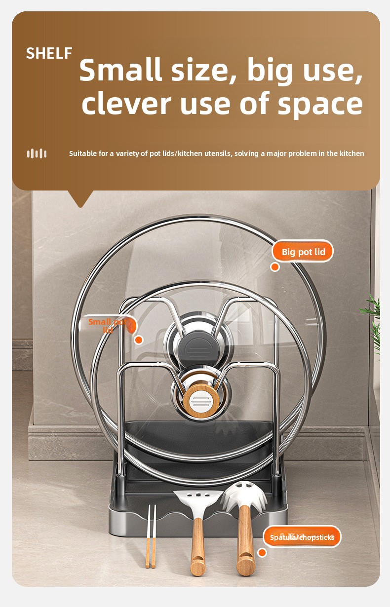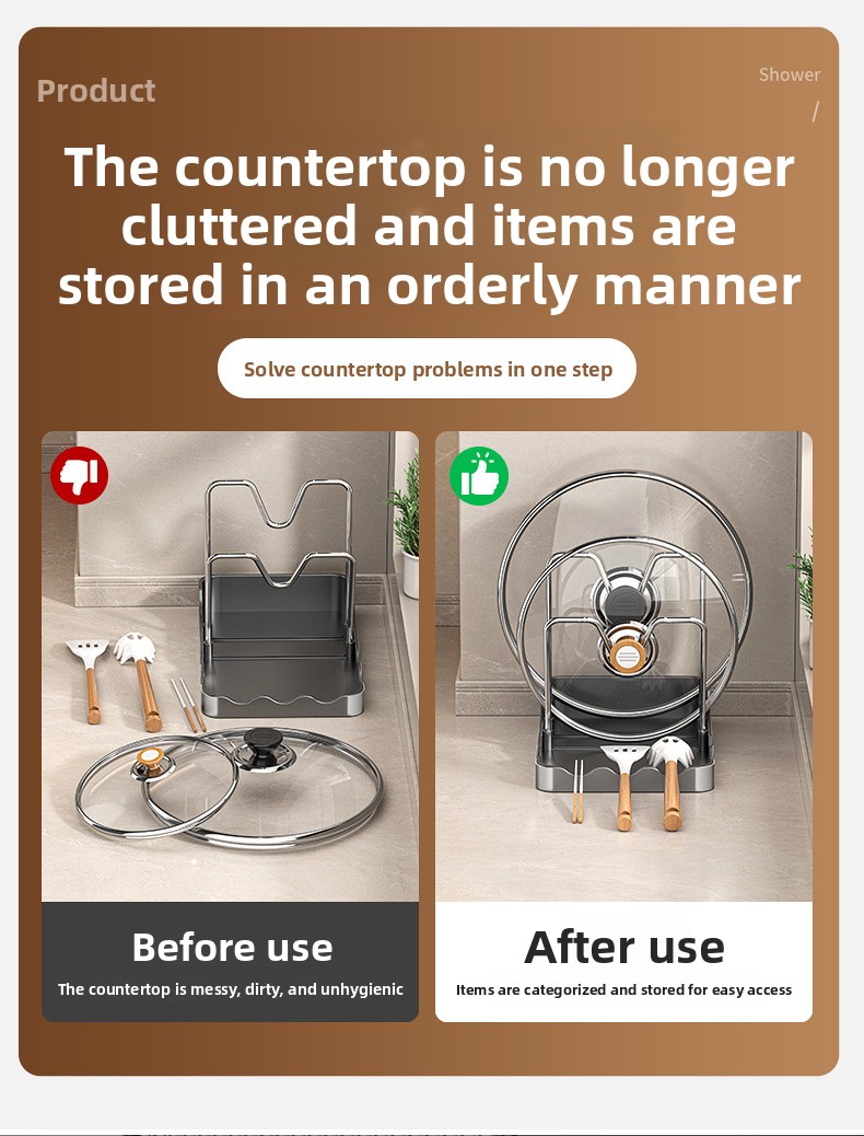 Space Saving: Compact design optimizes countertop space with efficient organization for pot lids and kitchen tools
