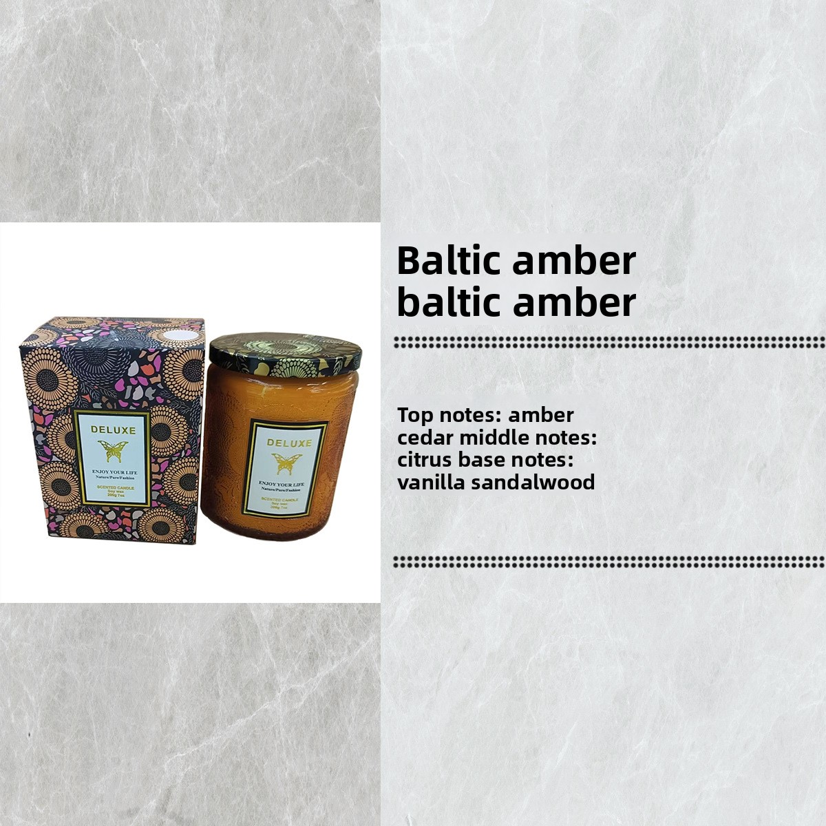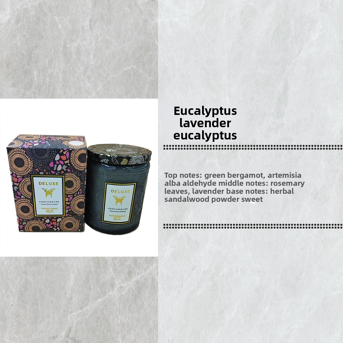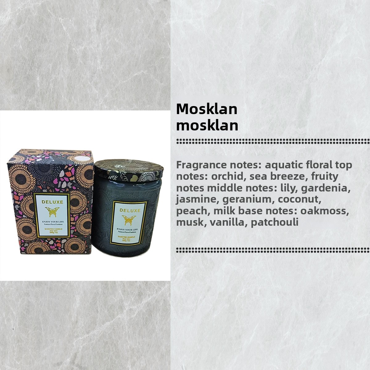 Candle with packaging and fragrance description on a textured gray background