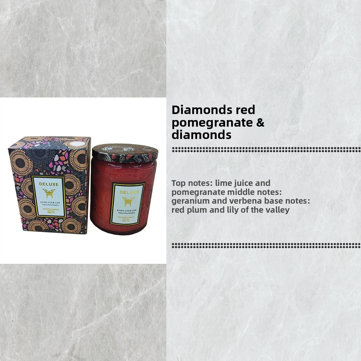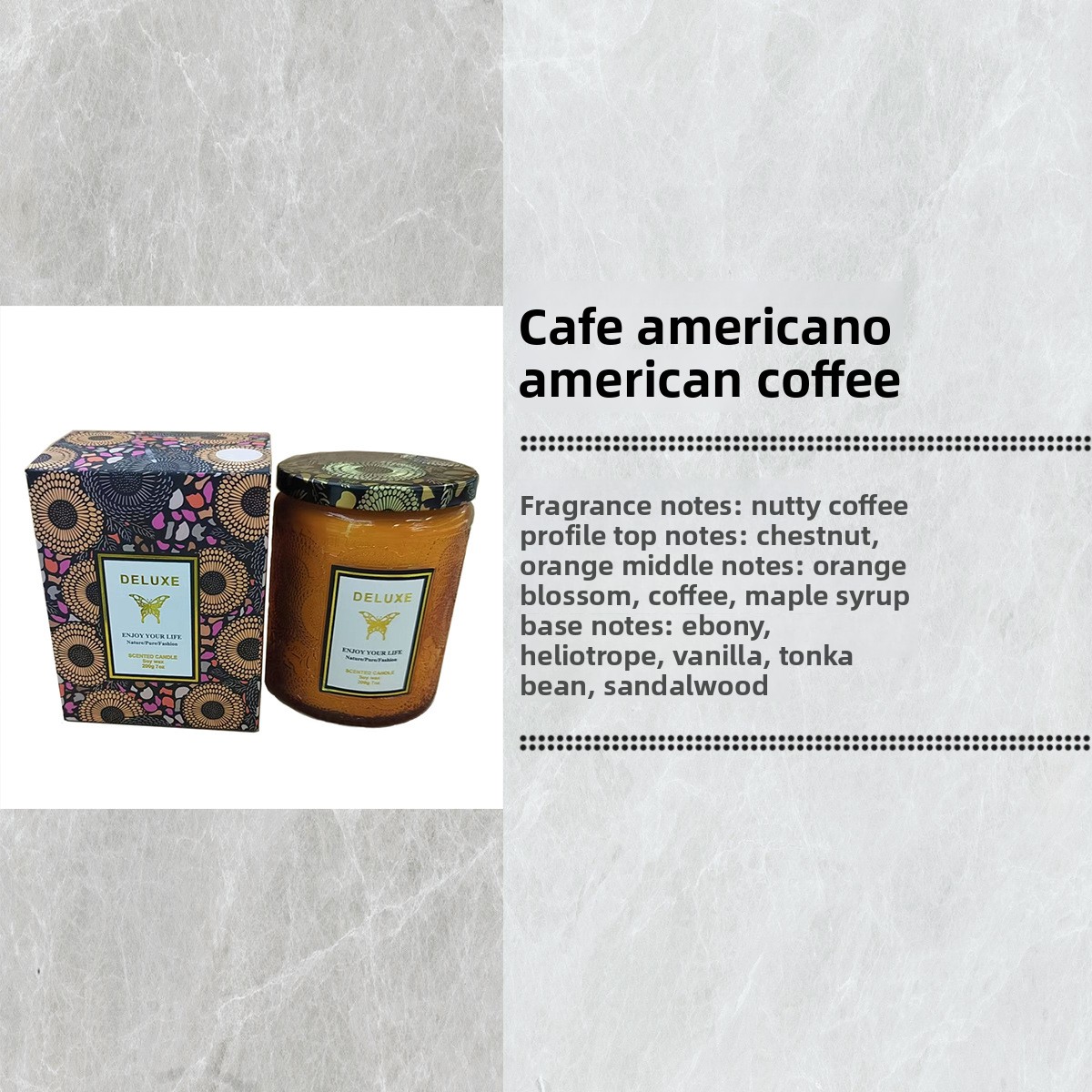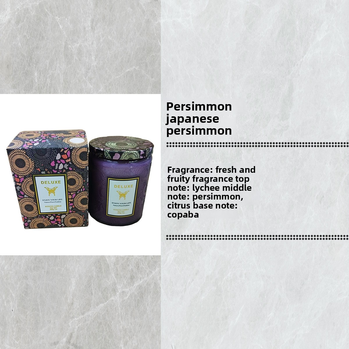 Candle with packaging and fragrance description on a textured gray background