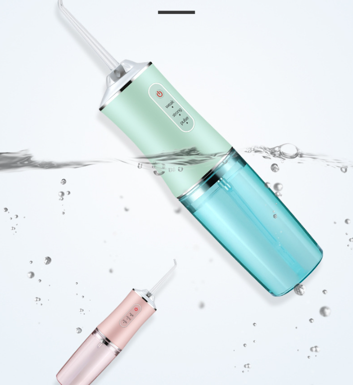 Portable water flosser with packaging, USB cable, and additional nozzles on a white background